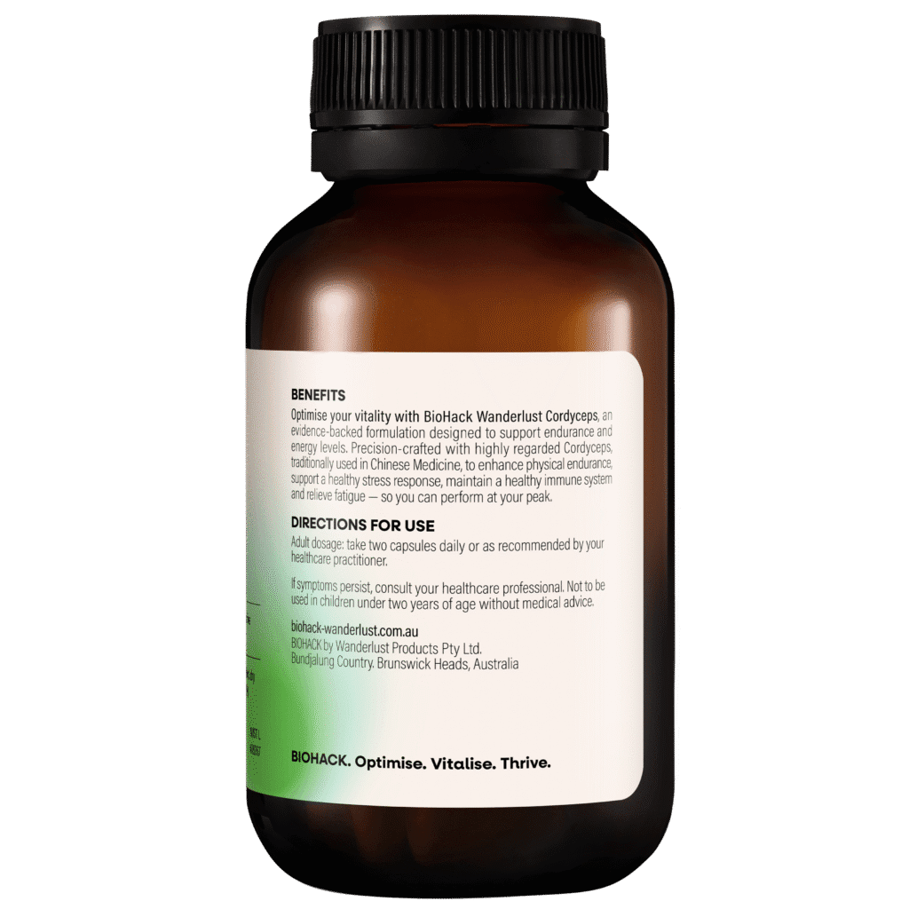 Optimise your vitality with BioHack Wanderlust Cordyceps, an evidence-backed formulation designed to support endurance and energy levels. Precision-crafted with highly regarded Cordyceps, traditionally used in Chinese Medicine, to enhance physical endurance, support a healthy stress response, maintain a healthy immune system and relieve fatigue — so you can perform at your peak.