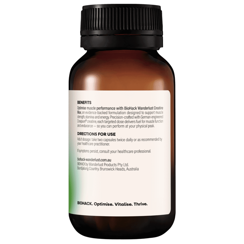 Optimise muscle performance with BioHack Wanderlust Creatine Max, an evidence-backed formulation designed to support muscle strength, stamina and energy. Precision-crafted with German-engineered Creapure® creatine, each targeted dose delivers fuel for muscle function and endurance — so you can perform at your physical peak.