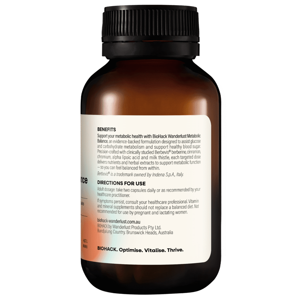 Support your metabolic health with BioHack Wanderlust Metabolic Balance, an evidence-backed formulation designed to assist glucose and carbohydrate metabolism and support healthy blood sugar. Precision-crafted with clinically studied Berbevis® berberine, cinnamon, chromium, alpha lipoic acid and milk thistle, each targeted dose delivers nutrients and herbal extracts to support metabolic function — so you can feel balanced from within.