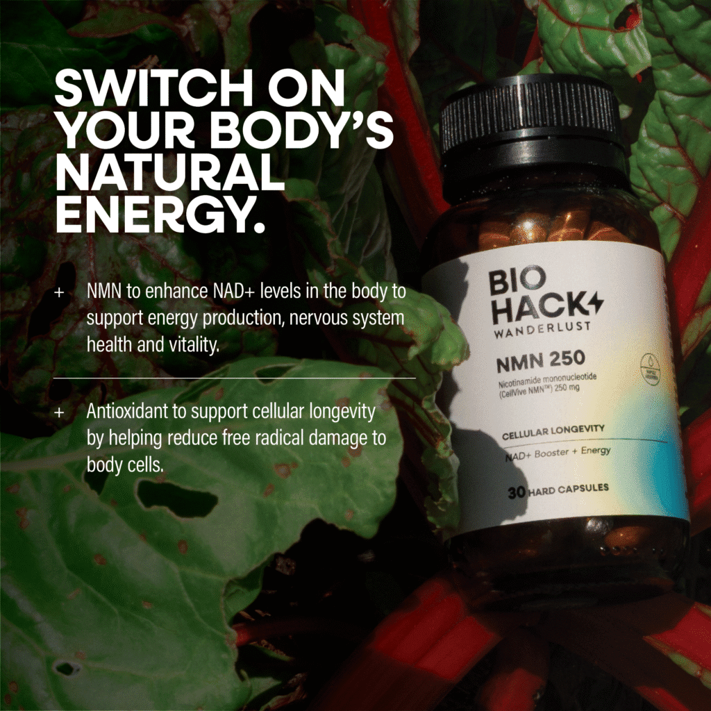 Switch on your body’s natural energy with BioHack Wanderlust NMN 250, an evidence-backed formulation designed to enhance NAD+ levels which naturally decline as we age. Precision-crafted with CellVive NMN™, a direct precursor of NAD+ that is rapidly absorbed and supports energy production. Each targeted dose maintains energy levels, supports nervous system function and delivers antioxidant support for cellular health — so you can live life fully charged.