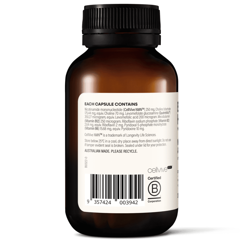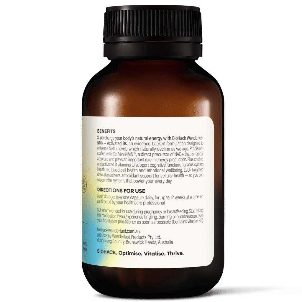 Supercharge your body’s natural energy with BioHack Wanderlust NMN + Activated Bs, an evidence-backed formulation designed to enhance NAD+ levels which naturally decline as we age. Precisioncrafted with CellVive NMNTM, a direct precursor of NAD+ that is rapidly absorbed and supports energy production. Plus choline and activated B vitamins to support cognitive function, nervous system health, red blood cell health and emotional wellbeing. Each targeted dose also delivers antioxidant support for cellular health — so you can support the systems that power your every day.